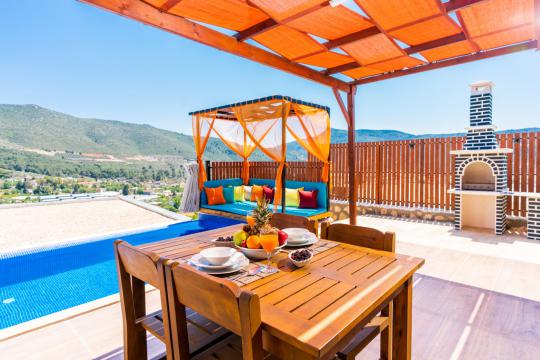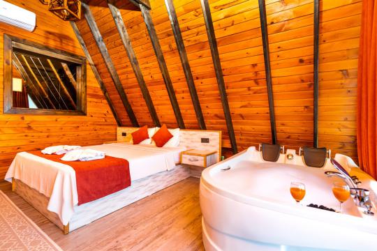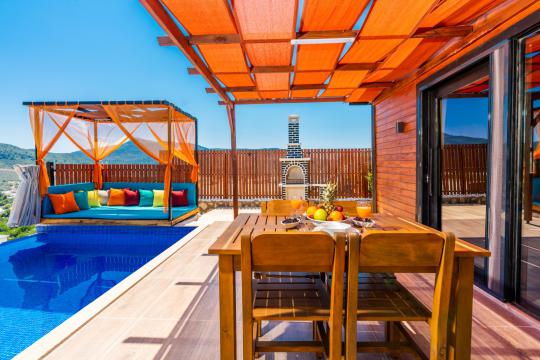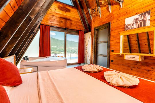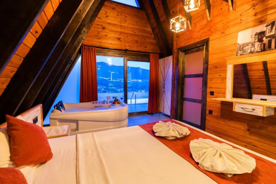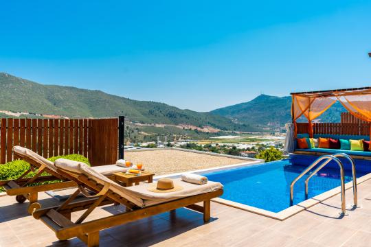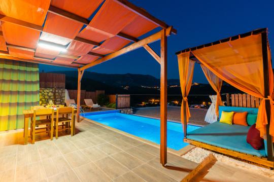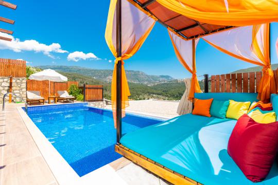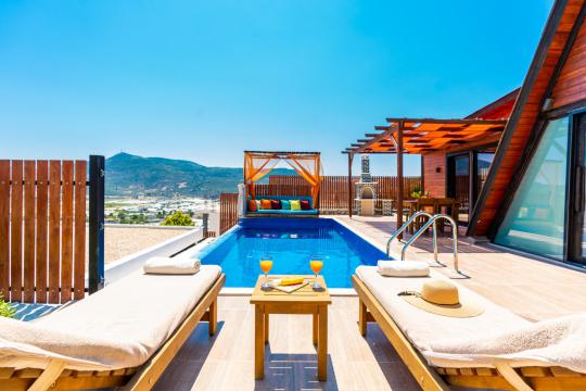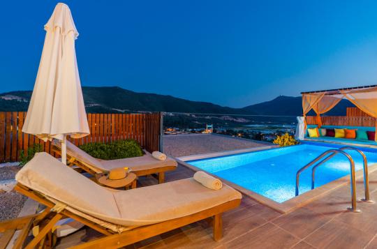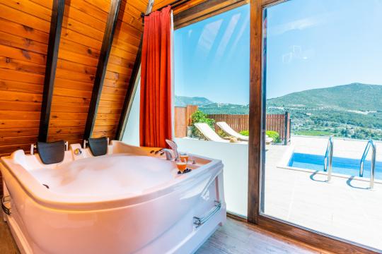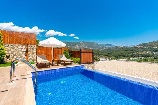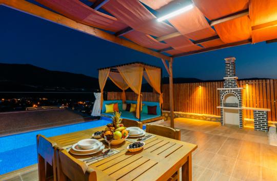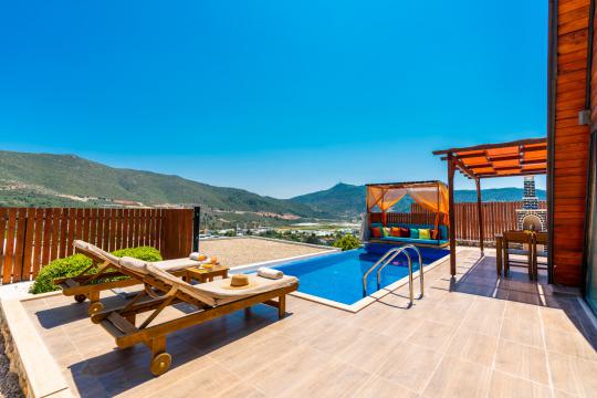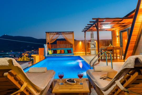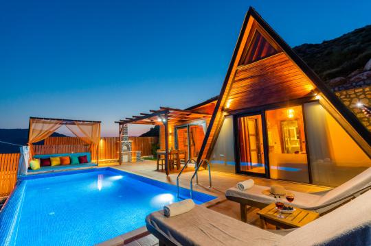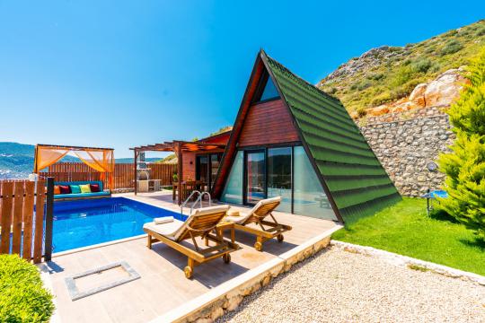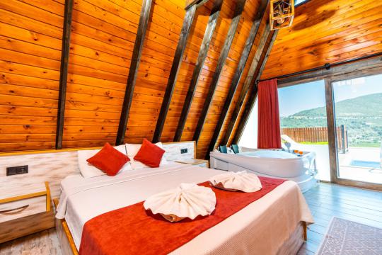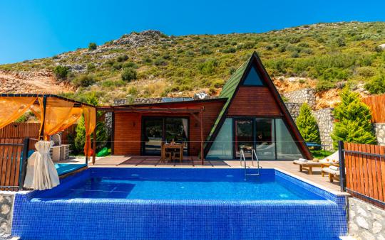 Kalkan Yeşilköy bölgesinde yer alan villamız 1 yatak odalı 2 kişi konaklama kapasitesine sahip balayı tatil villamızdır. Korunaklı havuz ve bahçe alanına sahip olan villamızın geniş bahçe alanında rahatça güneşlenip keyifli vakitler geçirebilirsiniz. Villamız ahşap detayları ile şık dizayna sahiptir. Yatak odasında çift kişilik jakuzisi bulunan villamız balayı çiftlerimiz için özenle dizayn edilmiştir.