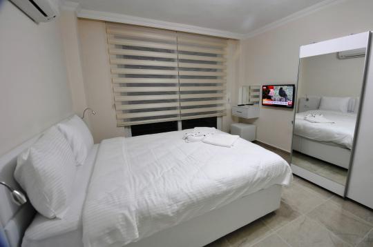 Çift kişilik yatak, Elbise dolabı, Komidin, Makyaj masası, Klima, Banyo, Balkon bulunmaktadır.