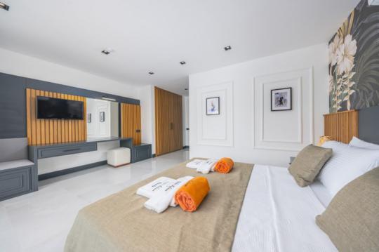 3.Yatak odası: Süit oda içerisinde 1 adet çift kişilik yatak, elbise dolabı, komodin, makyaj masası, saç kurutma makinası klima, banyo ve tuvalet bulunmaktadır.
