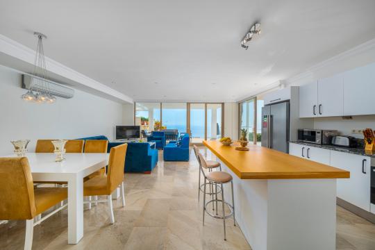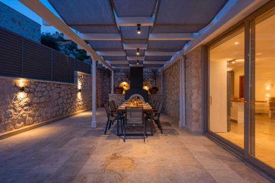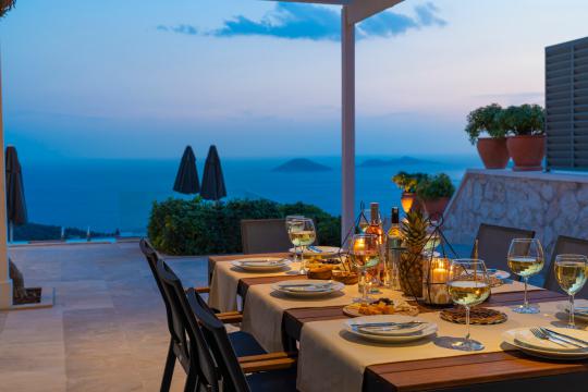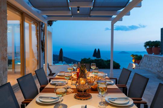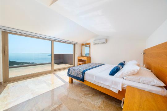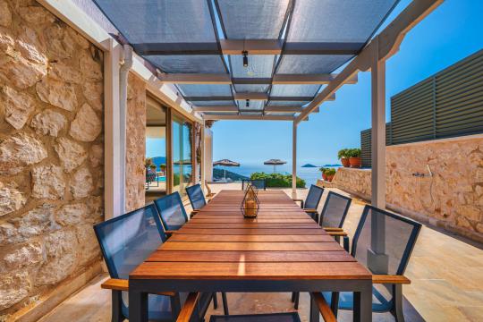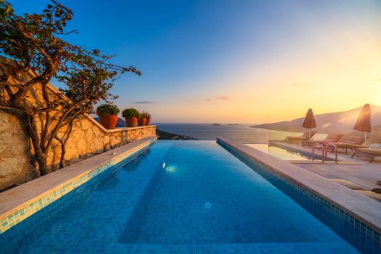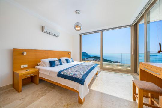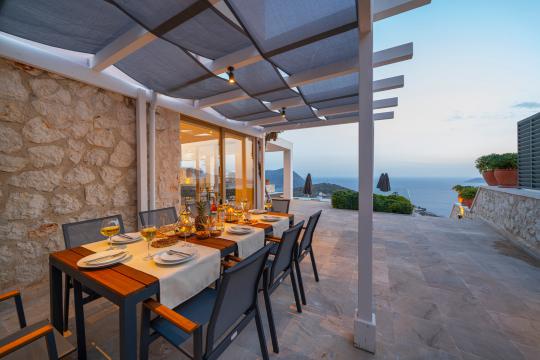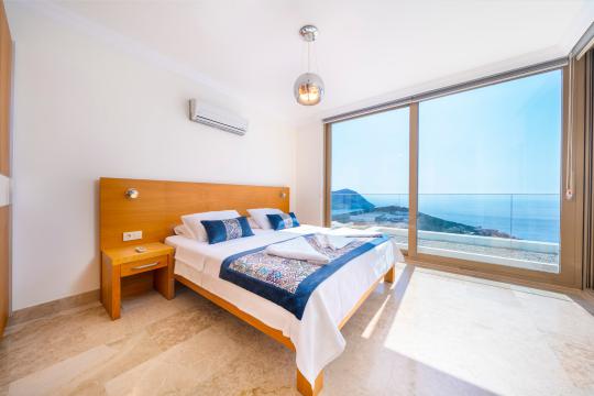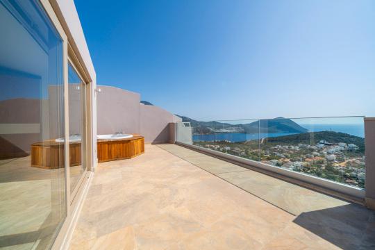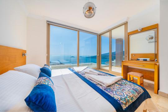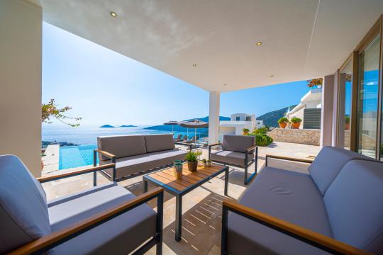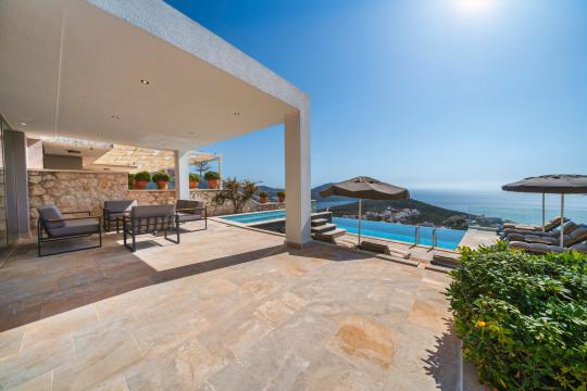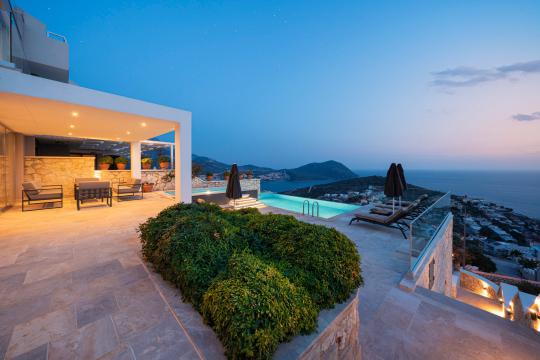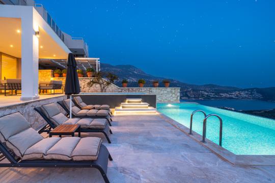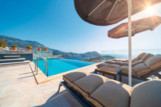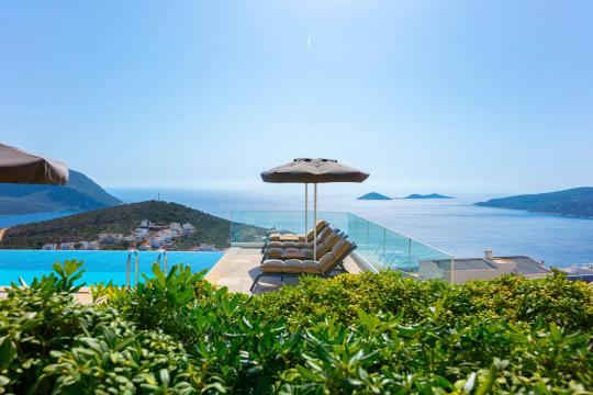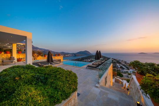 Kalkan'ın en popüler mevkilerinden bir tanesi olan Kalamar mevkiinde bulunan deniz manzaralı lüks kiralık villamız Villa Safran View; kusursuz bir tatil için sizleri bekliyor... 4 yatak odalı 8 kişi konaklama kapasiteli olan kiralık villamız kalabalık aileler ve arkadaş grupları için oldukça uygundur. Villamızın odaları aydınlık ve ferah bir yapıda olup, bir yatak odası diğer odalardan tamamen bağımsız olarak havuz katında, garajın hemen üstünde yer almaktadır. Bağımsız olan yatak odasının kendine ait mini bir mutfağı ve bahçeden ayrı girişi bulunmaktadır. Sonsuzluk havuzu bulunan lüks kiralık villamızın bahçe katı oldukça geniş olup cam korunaklıdır. Villamızın bahçe katında özel yüzme havuzuna entegre jakuzili sığ havuz, dinlenme alanı ve akşam yemekleriniz için yemek alanı bulunmaktadır. Tüm odaları full deniz manzaralı olan villamızın her köşesinden büyüleyici manzaranın keyfini çıkarabilirsiniz. Tatil boyunca kendinizi güvenli hissetmeniz için kamera sistemi bulunan jakuzili kiralık villamızda kapalı garaj mevcuttur. Lüks yapısı, muhteşem deniz manzarası ve eşsiz konumu ile sizlere unutamayacağınız bir tatil imkanı sunan lüks kiralık villamız "Villa Safran View"; Kalkan merkeze ve plaja 1 km uzaklıkta bulunmakta olup, istediğiniz her yere kolaylıkla ulaşım sağlayabilirsiniz.