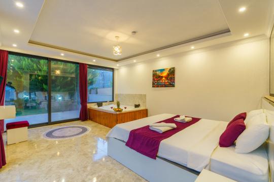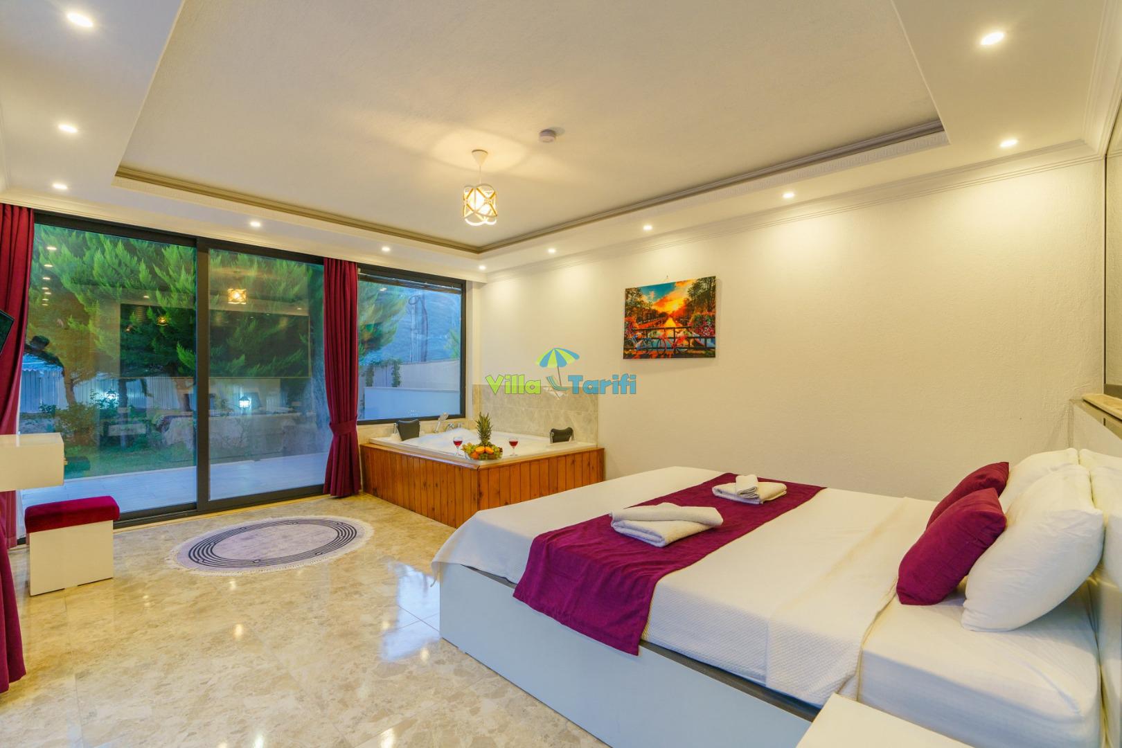 1. Yatak Odası : Bir adet çift kişilik yatak, elbise dolabı, komodin, makyaj masası, jakuzi, klima mevcuttur. Özel banyo ve tuvalet bulunmaktadır.