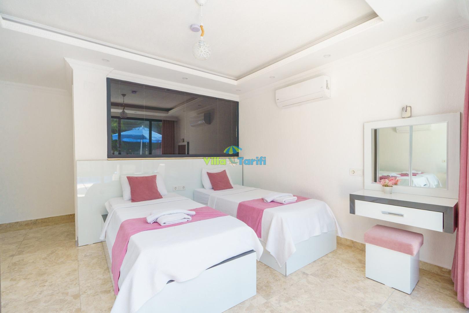 2. Yatak Odası : İki adet tek kişilik yatak, elbise dolabı, komodin, makyaj masası, klima mevcuttur. Özel banyo ve tuvalet bulunmaktadır.